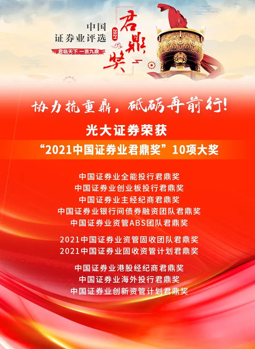 10月28日,由《证券时报》主办的“2021中国证券业君鼎奖”评选结果揭晓。光大证券荣获“中国证券业全能投行君鼎奖”“中国证券业创业板投行君鼎奖”“中国证券业主经纪商君鼎奖”等五大奖项。公司子公司光证资管荣获“中国证券业固收资管计划君鼎奖”“中国证券业资管固收团队君鼎奖”;香港子公司荣获“中国证券业海外投行君鼎奖”“中国证券业港股经纪商君鼎奖”“中国证券业创新资管计划君鼎奖”。