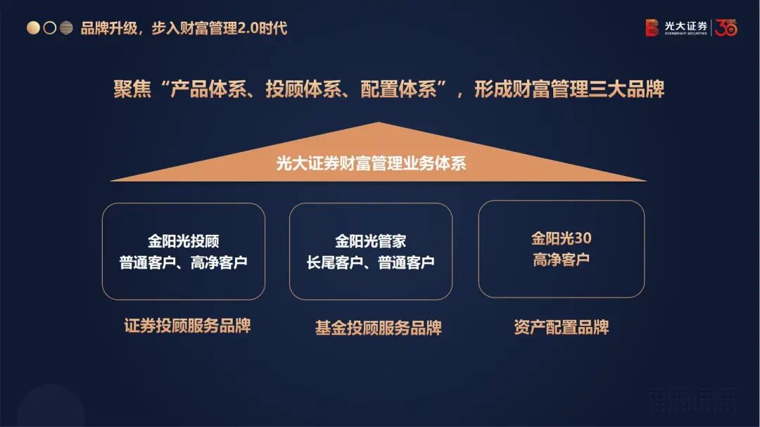 2020年7月,光大证券推出金阳光财富管理品牌,积极融入光大集团六大E-SBU协同战略,持续推动财富管理转型,走出了一条以产品为中心的金融产品销售,向以客户为中心的全生命周期资产配置的财富管理转型路径,实现了从研究到策略、产品、组合、配置、服务的全流程。当前,三大财富管理业务品牌精准做到客户分层。其中,“金阳光30”是面向高净值客户的资产配置品牌,还有面向普通客户、长尾客户的证券投顾服务品牌“金阳光投顾”以及基金投顾服务品牌“金阳光管家”。
