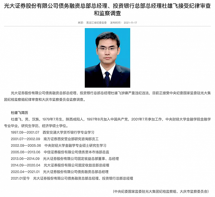 11月17日,黑龙江省纪委监委官网公告,光大证券债务融资总部总经理、投资银行总部总经理杜雄飞涉嫌严重违纪违法,目前正接受中央纪委国家监委驻光大集团纪检监察组纪律审查和大庆市监察委员会监察调查。