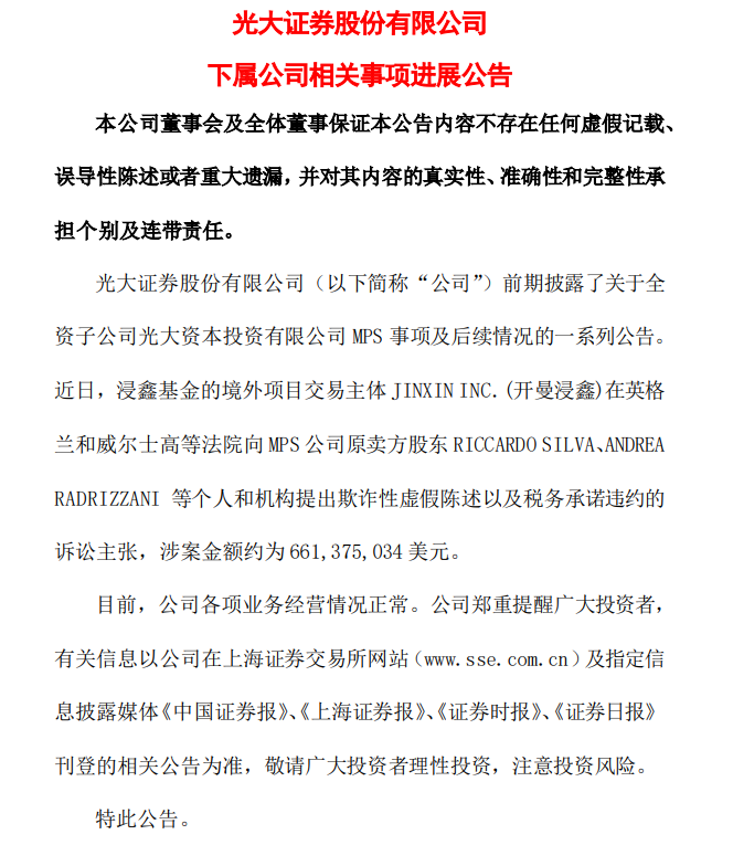 不过,光大证券没有坐以待毙。2021年6月,光大证券发布公告称,浸鑫基金的境外项目交易主体JINXIN INC.(开曼浸鑫),已经在英格兰和威尔士高等法院,向MPS公司原卖方股东卡多·席尔瓦(Riccardo Silva)、安德烈·拉德里扎尼(Andrea Radrizzani)等个人和机构提出欺诈性虚假陈述以及税务承诺违约的诉讼主张,涉案金额约为6.61亿美元,约合人民币逾42亿元。