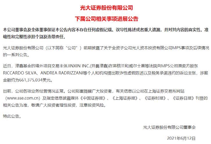 光大证券在公告里表示,上海浸鑫投资咨询合伙企业(有限合伙)(下称上海浸鑫基金)的境外项目交易主体JINXINNC.(开曼浸鑫)在英格兰和威尔士高等法院向MPS公司原卖方股东RICCARDO SILVA ANDREA RADRZZANI等个人和机构提出欺诈性虚假陈述以及税务承诺违约的诉讼主张,涉案金额约为6.61亿美元(约合人民币42亿元)。