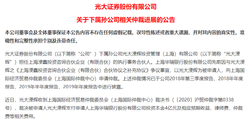 2020年5月11日晚间,光大证券发布公告,称光大浸辉于近日收到上海国际经济贸易仲裁委员会的裁决书,裁决被申请人光大浸辉支付申请人上海华瑞银行股份有限公司投资本金 4 亿元及相应预期收益、律师费、仲裁费等相关费用。