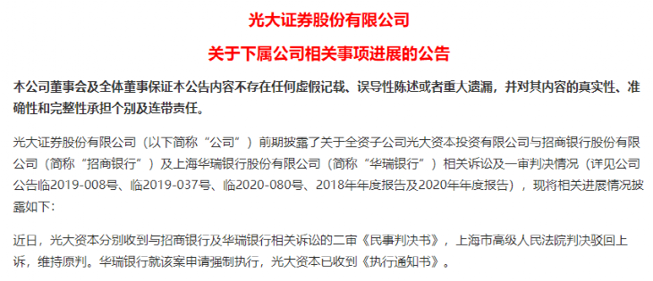 去年8月,根据光大证券发布的下属公司诉讼及仲裁进展公告,其子公司光大资本一审被判决向招商银行、华瑞银行合计支付35.16亿元。?而该案件的二审也是维持原判。