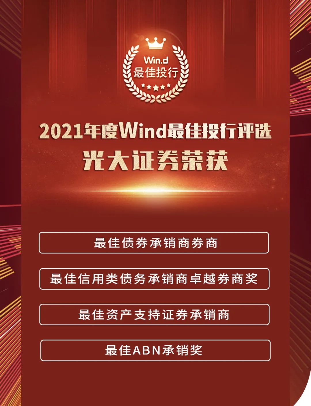 近日,2021年度Wind最佳投行评选结果出炉,光大证券凭借优秀的承销业绩,荣获“最佳债券承销商券商”等4项大奖。