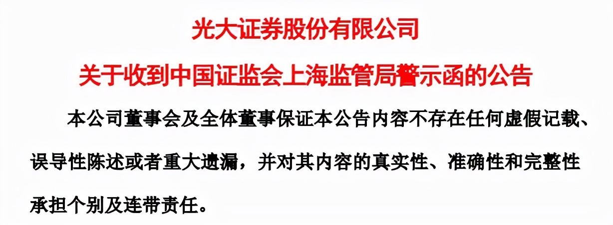 1月8日,光大证券发布的一则公告显示,该公司于昨日收到来自证监会上海监管局的警示函。监管方面就光大证券存在的重大合同披露不及时,重大事件进展披露不及时,业绩预告信息披露不准确、不充分等五项问题进行了公示。