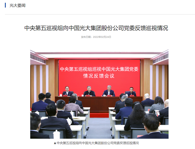 今年2月22日,中央第五巡视组向中国光大集团股份公司党委反馈了巡视情况,指出巡视中发现了一些问题,包括:践行以人民为中心的发展理念不够到位,推动金融板块回归本源、专注主业还有不足,服务实体经济和国家重大发展战略存在薄弱环节,防范化解重大风险隐患存在差距,落实深化改革要求不够到位,内部治理体系有短板;履行全面从严治党“两个责任”有差距,责任压力传导不够,严的氛围没有形成,重点领域和关键岗位廉洁风险较高,形式主义、官僚主义问题比较突出,部分直管企业违反中央八项规定精神问题屡禁不止;领导班子担当作为有不足,攻坚克难意识不强,选人用人和干部人才队伍建设还有差距,基层党组织战斗堡垒作用发挥不充分;整改主体责任落实不够有力,个别问题整改不到位。