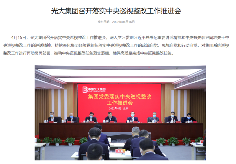 光大集团官网显示,4月15日,光大集团召开落实中央巡视整改工作推进会。会议要求,集团各级党委要层压实责任,对照巡视整改任务书、时间表、路线图,不折不扣将整改要求落到实处。