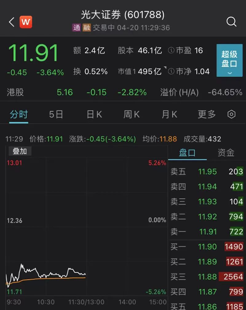 今日盘前紧急发布公告后,光大证券股价早盘一度低开超5%,领跌券商板块。截至午间收盘,光大证券跌幅有所收敛,报11.91元,下跌3.64%。