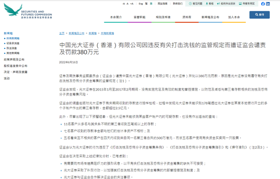 具体看,6月16日,香港证监会公告称,中国光大证券(香港)有限公司因违反有关打击洗钱的监管规定而遭香港证监会谴责及罚款380万。香港证监会发现,中国光大证券(香港)有限公司在2015年1月至2017年2月期间,没有实施充足及有效的制度和管控措施,以防范及减低与第三者存款相关的洗钱及不法分子资金筹集风险。香港证监会对中国光大证券(香港)有限公司于上述期间内收到的存款进行抽样检视,过程中发现中国光大证券(香港)有限公司未能识别178笔透过其在某家本地银行开立的多个子帐户作出的第三者存款,金额超过2.5亿港元。