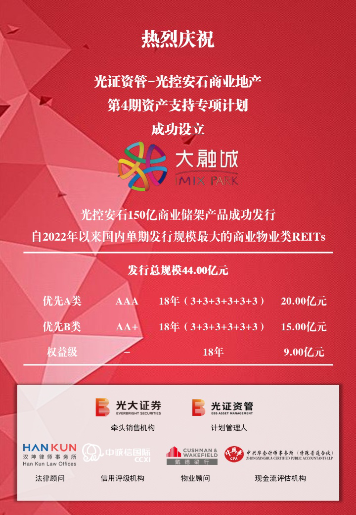 7月19日,光大证券助力珠海安石宜奈投资中心(作为原始权益人)以及光控安石(北京)投资管理有限公司(作为基金管理人、资产服务机构)顺利完成“光证资管-光控安石商业地产第4期资产支持专项计划类REITs”项目的发行及设立工作。光大证券担任牵头销售机构,子公司光证资管作为计划管理人,共同为光大安石(北京)房地产投资顾问有限公司(以下简称“光大安石”)提供优质高效的资产证券化项目推进及产品销售全程服务。