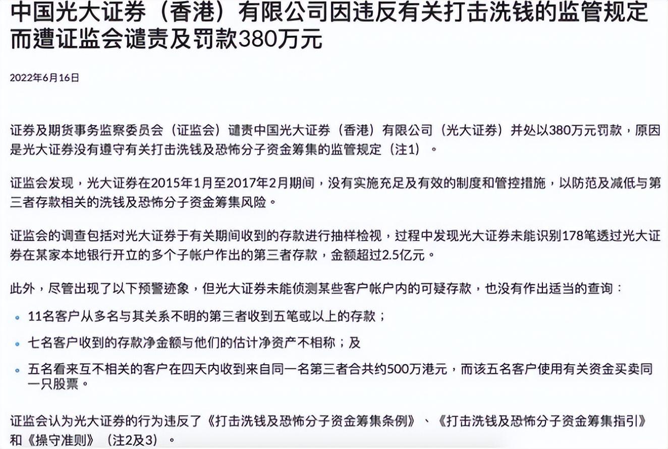 值得关注的是,仅在赵陵上任公司董事长的几天后,光大证券就收到了香港证监会的罚单,称光大证券(香港)因违反有关打击洗钱的监管规定而遭受谴责及罚款380万元。