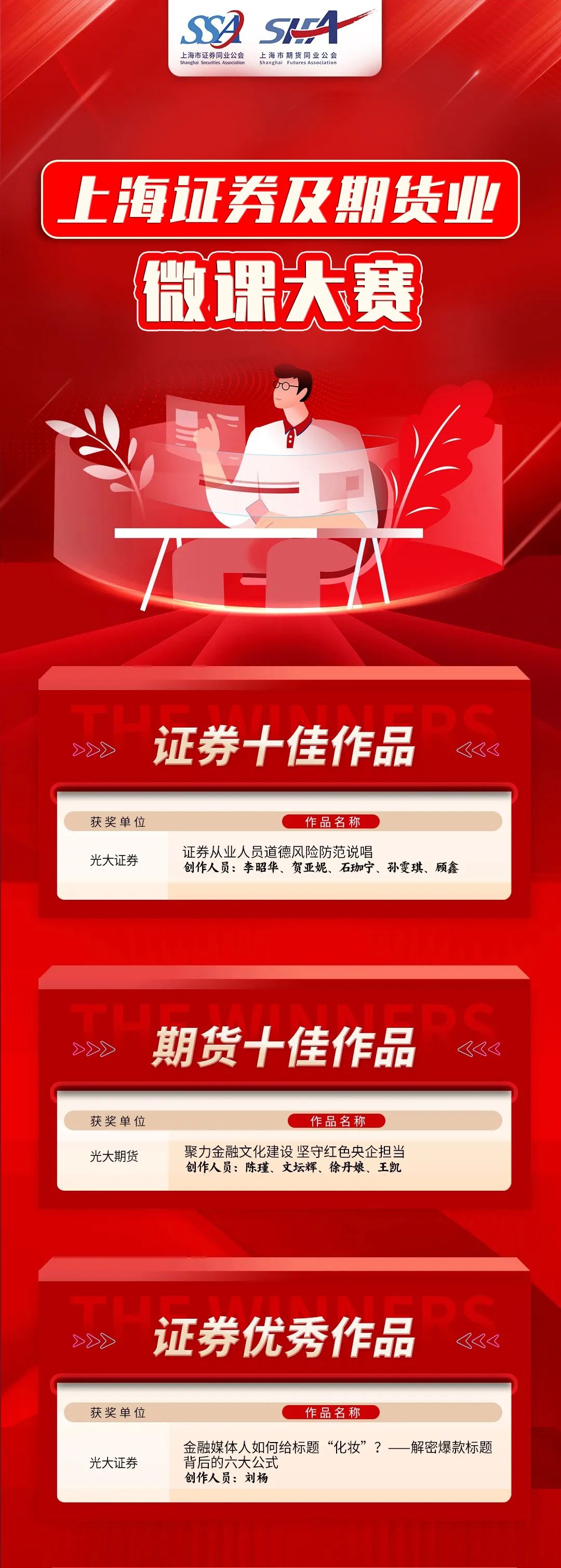 近期,在2022年上海证券及期货业微课大赛中,光大证券三支参赛队伍分别获得“证券十佳作品”“期货十佳作品”“证券优秀作品”奖项。