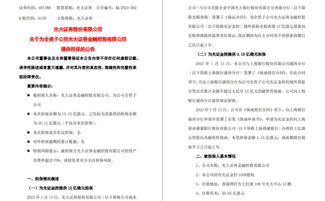 就在不久前的1月17日,光大证券发布了《关于为全资子公司光大证券金融控股有限公司提供担保的公告》。