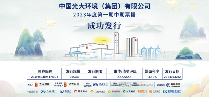 3月3日,光大证券牵头主承销的“中国光大环境(集团)有限公司2023年度第一期中期票据”成功发行,发行金额20亿元,期限为3年,最终发行利率3.10%。