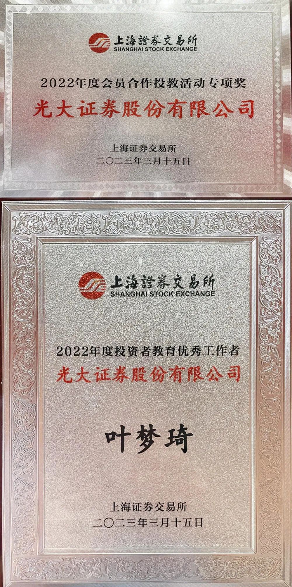 投资者教育是资本市场高质量发展的根基。多年来,光大证券不断适应新形势新要求,推陈出新,持续深化投资者教育和服务,组织开展了一系列卓有成效的投教活动。3月15日,在国际消费者权益保护日当天,上海证券交易所举办“全面注册制改革向未来”投资者保护主题活动暨2022年度会员投资者教育和保护评选表彰交流会,光大证券喜获上交所2022年度会员合作投教活动专项奖和2022年度投资者教育优秀工作者(广东分公司叶梦琦)奖项。公司投教工作成果得到上交所的肯定和好评。