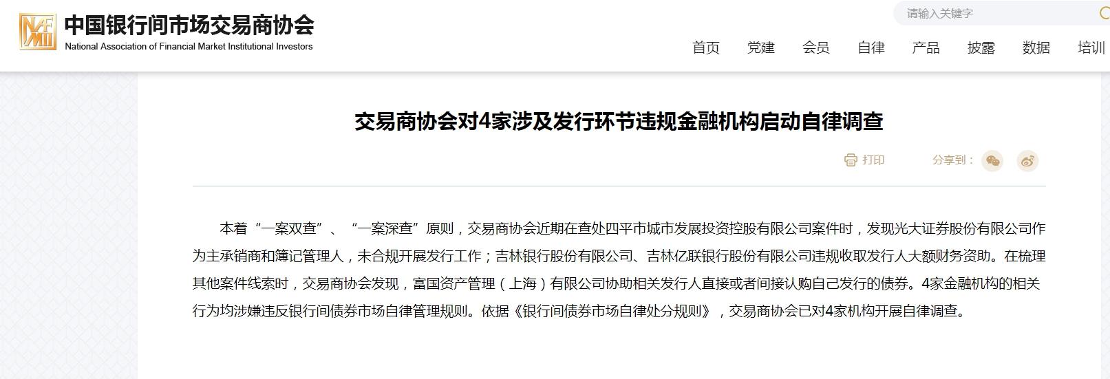 据悉,交易商协会近期在查处四平市城市发展投资控股有限公司(以下简称“四平城投”)案件时,发现光大证券股份有限公司作为主承销商和簿记管理人,未合规开展发行工作;吉林银行股份有限公司、吉林亿联银行股份有限公司违规收取发行人大额财务资助。