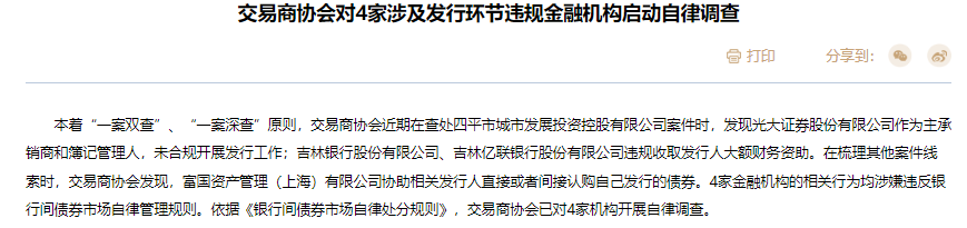 3月31日,中国银行间市场交易商协会公布的一则公告显示,交易商协会近期在查处四平市城市发展投资控股有限公司案件时,发现光大证券股份有限公司作为主承销商和簿记管理人,未合规开展发行工作;吉林银行股份有限公司、吉林亿联银行股份有限公司违规收取发行人大额财务资助。在梳理其他案件线索时,交易商协会发现,富国资产管理(上海)有限公司协助相关发行人直接或者间接认购自己发行的债券。4家金融机构的相关行为均涉嫌违反银行间债券市场自律管理规则。依据《银行间债券市场自律处分规则》,交易商协会已对4家机构开展自律调查。