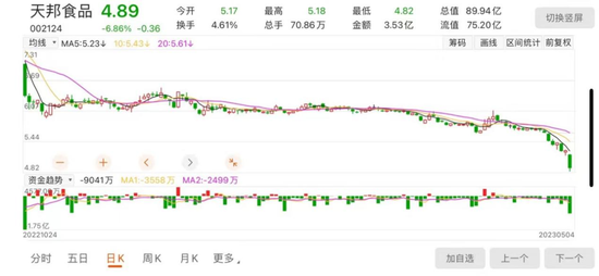 从盘面来看,5月4日,天邦食品开盘后一路走低,至收盘跌6.86%,报4.89元,总市值近90亿元。当日全天成交额达3.53亿元,换手率4.61%。