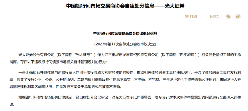 值得注意的是,6月5日,光大证券作为四平市城市发展投资控股有限公司(以下简称“四平城投”)相关债务融资工具的主承销商,刚因四项违规行为被中国银行间市场交易商协会严重警告、责令改正。