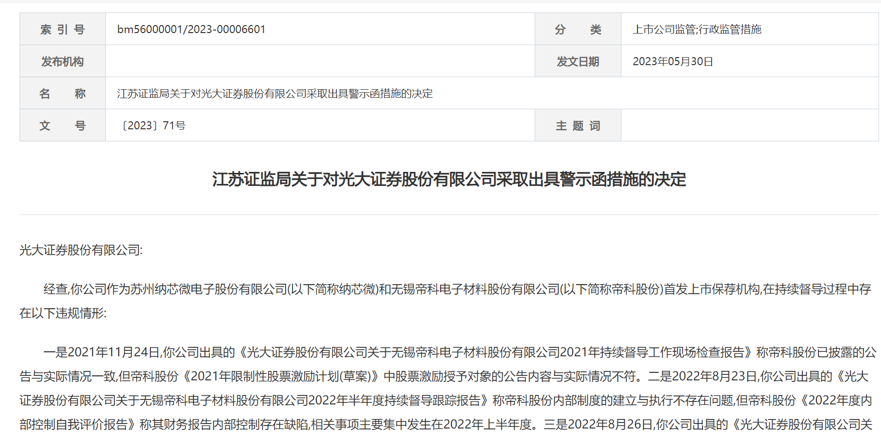 6月6日,江苏证监局公告对光大证券采取出具警示函的的行政监管措施。江苏证监局在公告中表示,经查,光大证券作为苏州纳芯微电子股份有限公司(以下简称“纳芯微”)和无锡帝科电子材料股份有限公司(以下简称“帝科股份”)首发上市保荐机构,在持续督导过程中存在以下违规情形: