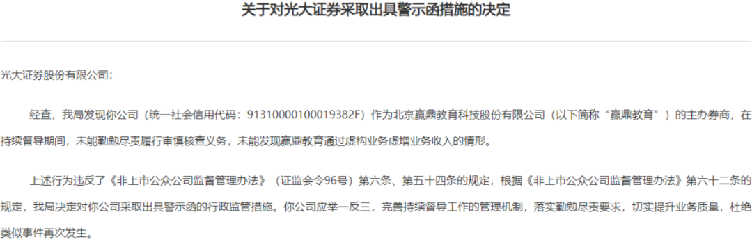 早在此之前的2月,光大证券还因作为北京赢鼎教育科技股份有限公司(以下简称“赢鼎教育”)的主办券商,在持续督导期间,未能勤勉尽责履行审慎核查义务,未能发现赢鼎教育通过虚构业务虚增业务收入的情形;违反了《非上市公众公司监督管理办法》(证监会令96号)第六条、第五十四条的规定。