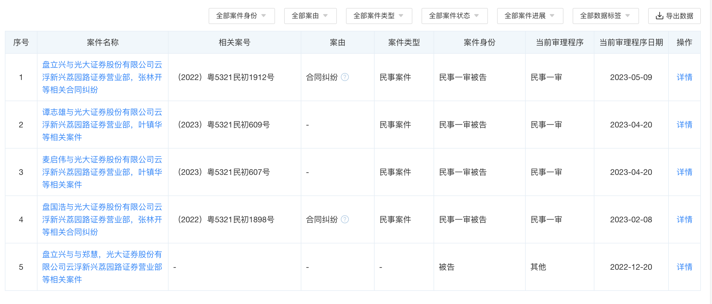 显示,光大证券云浮新兴荔园路证券营业部从2022年年底至今,涉嫌多起民事诉讼案件,前后共有4位当事人状告该营业部及旗下多名员工,此次被广东证监局“点名”的张林开、李国新、叶镇华便在其中。