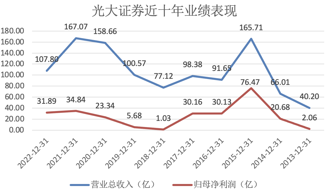 自2018年业绩“滑铁卢”之后,2019年至2021年,光大证券的业绩缓慢回升,2021年时的营业收入已赶超2015年,但从归母净利润来看仍未恢复到2015年的“高光水平”。