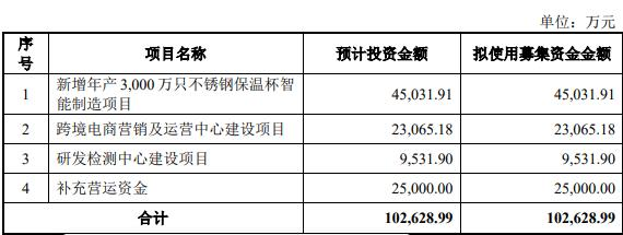 同富股份原拟在上交所主板发行不超过3,402万股,原拟募集资金102,628.99万元,计划用于新增年产 3,000 万只不锈钢保温杯智能制造项目、跨境电商营销及运营中心建设项目、研发检测中心建设项目、补充营运资金。