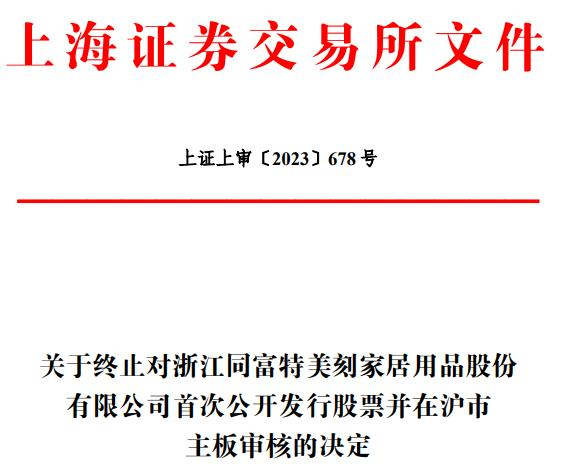 上交所于2023年3月2日依法受理了同富股份首次公开发行股票并在沪市主板上市的申请文件,并按照规定进行了审核。2023年8月31日,同富股份和保荐人光大证券股份有限公司分别向上交所提交了《浙江同富特美刻家居用品股份有限公司关于撤回首次公开发行股票并在主板上市申请文件的申请报告》(同富特美刻[2023]9号)和《关于撤回浙江同富特美刻家居用品股份有限公司首次公开发行股票并在主板上市申请文件的申请报告》(光证报[2023]301号),申请撤回申请文件。根据《上海证券交易所股票发行上市审核规则》第六十三条的有关规定,上交决定终止对同富股份首次公开发行股票并在沪市主板上市的审核。