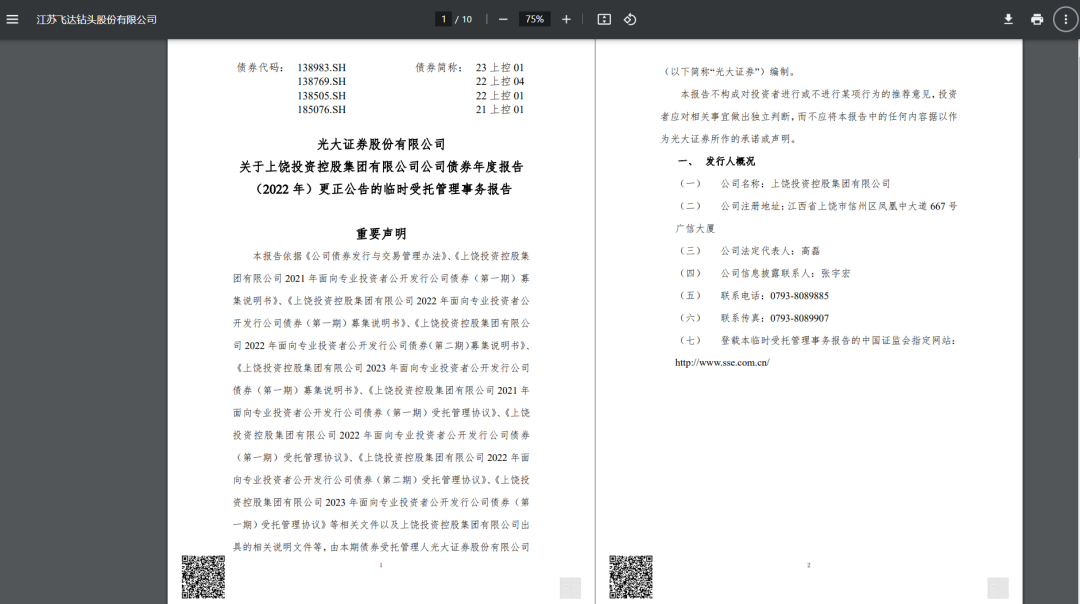 通过证监会官网,行家浏览资本市场电子化信息披露平台,发现光大证券在9月19日更新发布了《关于上饶投资控股集团有限公司公司债券年度报告(2022年)更正公告的临时受托管理事务报告》。