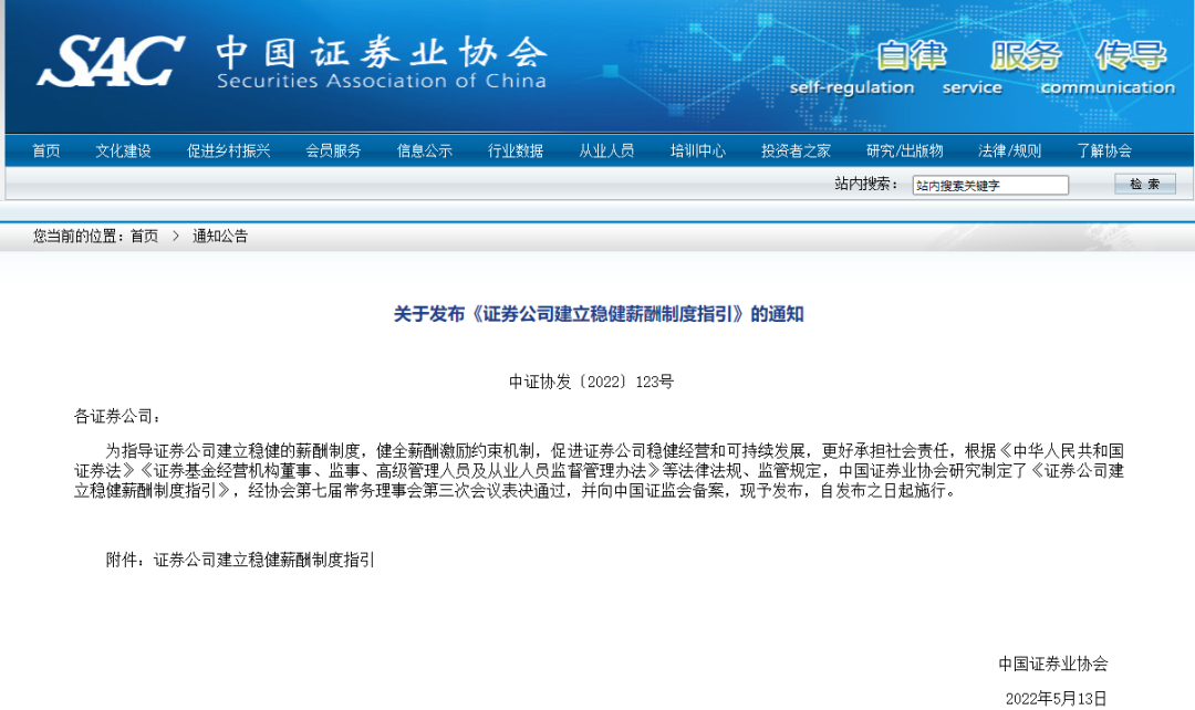 2022年5月13日,中国证券业协会正式发布《证券公司建立稳健薪酬制度指引》!