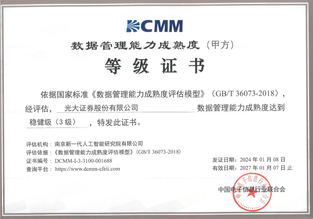 近日,中国电子信息行业联合会公布数据管理能力成熟度(DCMM)等级证书企业名单。光大证券顺利通过稳健级(3级)认证,标志着公司数据治理在行业的实力和领先地位。