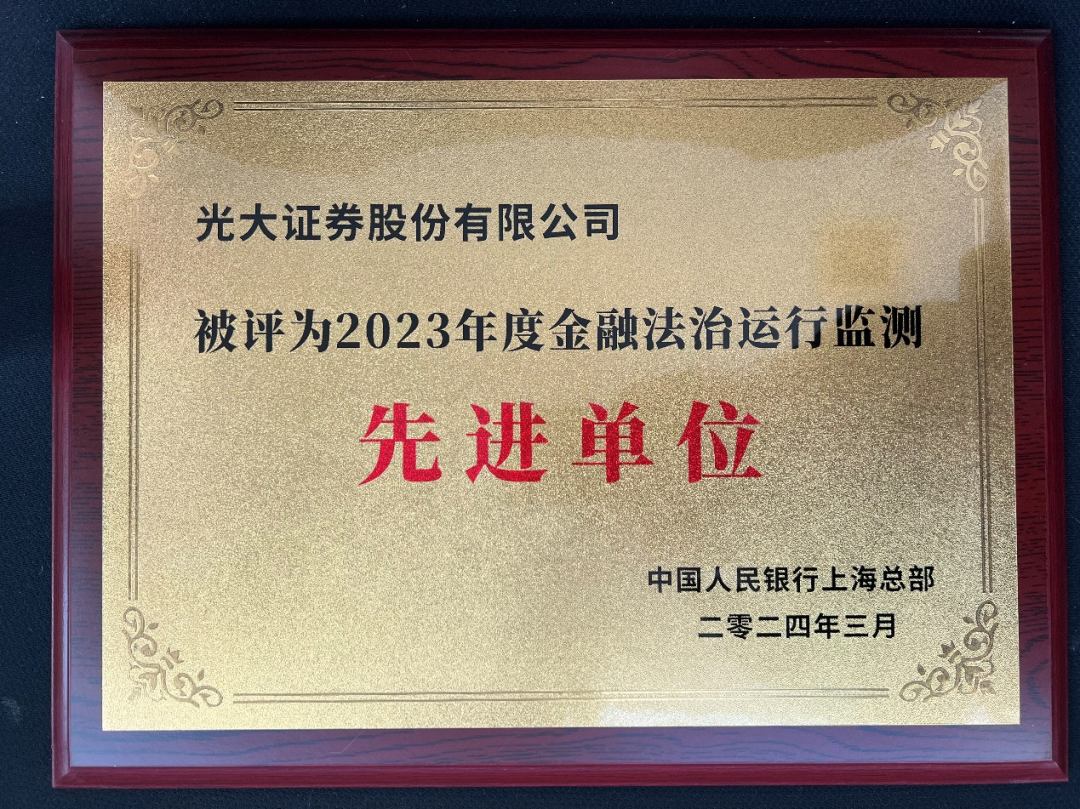 近日,中国人民银行上海总部下发通报,光大证券获评2023年度金融法治运行监测点先进单位,是上海唯一一家两次获评此项荣誉的证券公司。
