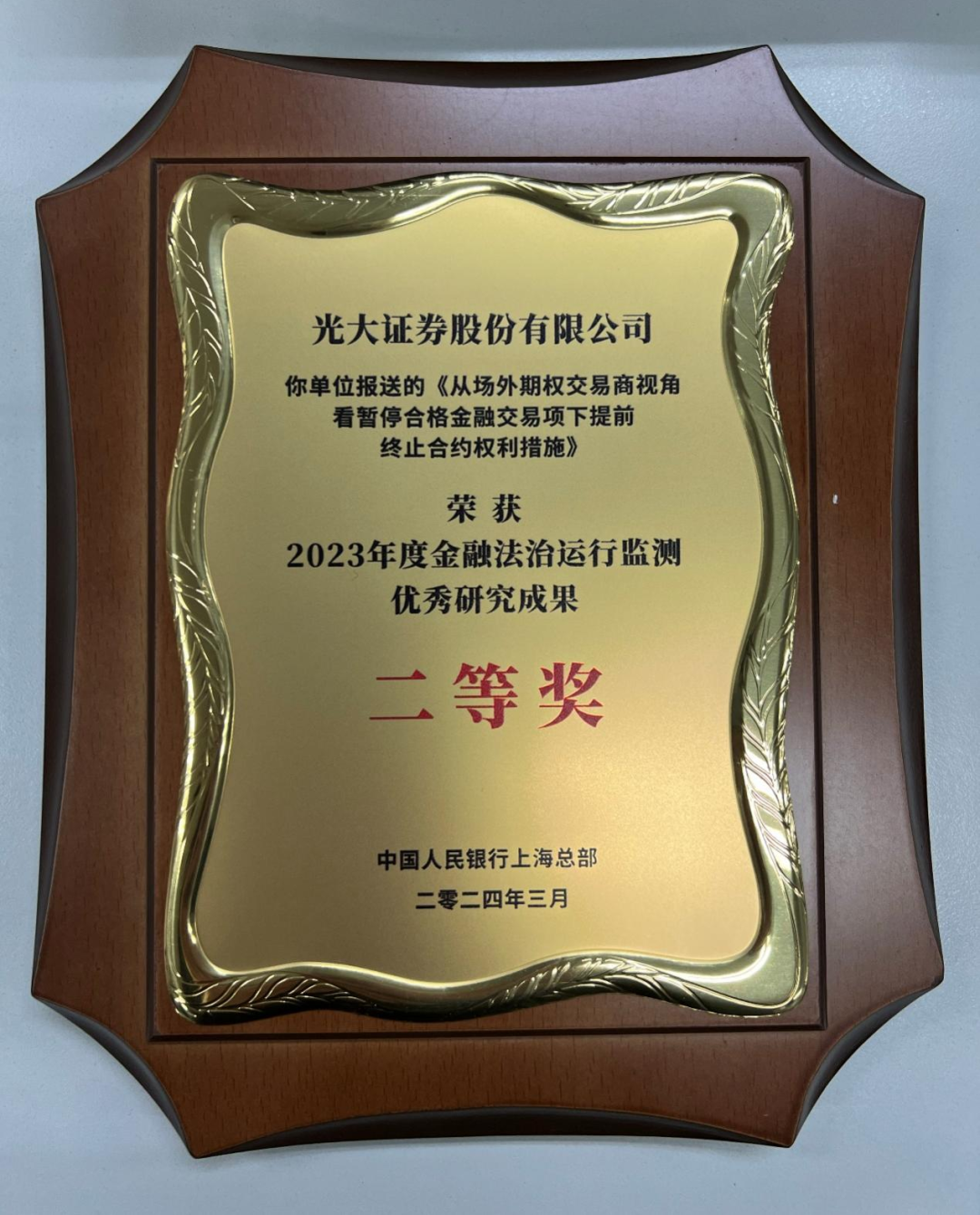 研究成果方面,光大证券报送的《从场外期权交易商视角看暂停合格金融交易项下提前终止合约权利措施》和《从北京金融法院1号案件看银行间债券市场虚假陈述案件的审判趋势》2篇研究报告,分别获得2023年度金融法治运行监测点优秀研究成果二等奖和三等奖。