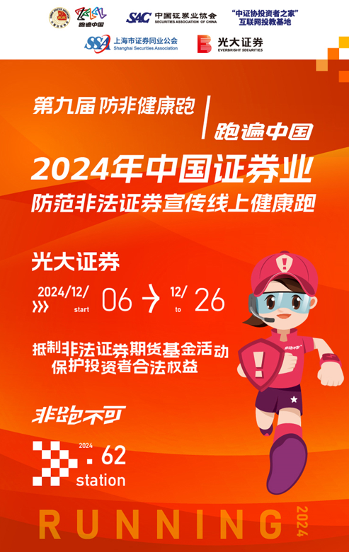 12月6日,由中国证券业协会携手中国田径协会、“中证协投资者之家”互联网投教基地、上海市证券同业公会、光大证券联合举办的“2024年中国证券业防非宣传健康跑·光大证券站”(简称“防非跑”)活力开启。本次活动以“抵制非法证券期货基金活动,保护投资者合法权益”为主题,旨在进一步加强防范打击非法金融活动、治理金融领域非法中介的工作力度,更为有效地保护投资者,特别是中小投资者的合法权益。