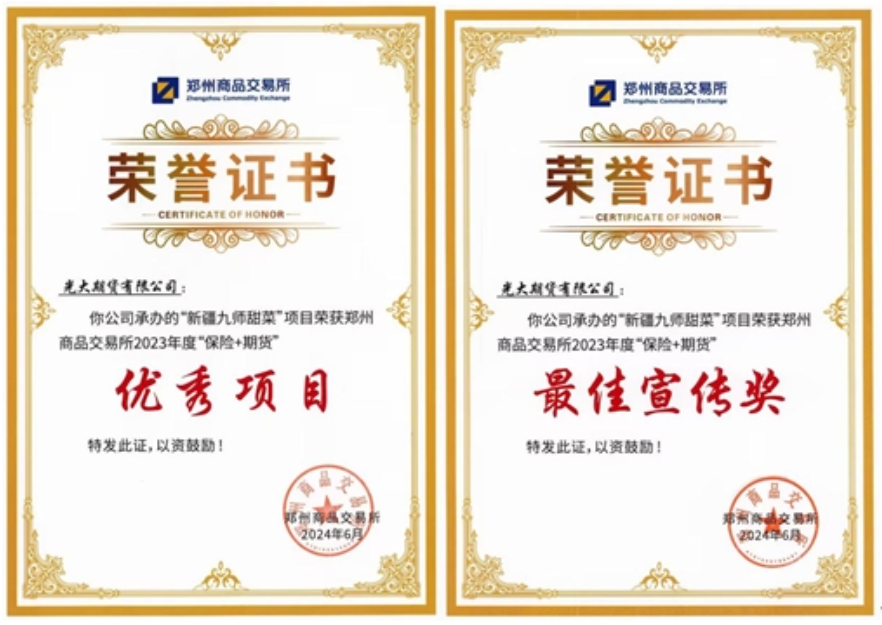 光大期货参与的新疆九师甜菜“保险+期货”试点项目,获得郑州商品交易所2023年度“保险+期货”优秀项目和最佳宣传奖。来源:光大证券