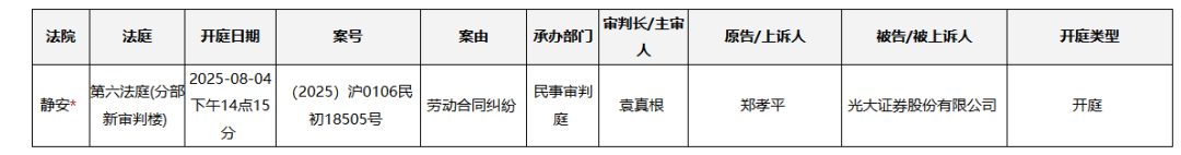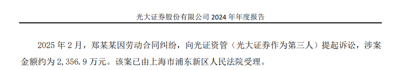 在此之前,光大证券发布于今年3月的2024年报中,出现了一条“线索”:2025年2月,郑某某因劳动合同纠纷,向光证资管(光大证券作为第三人)提起诉讼,涉案金额约为2,356.9万元。该案已由上海市浦东新区人民法院受理。