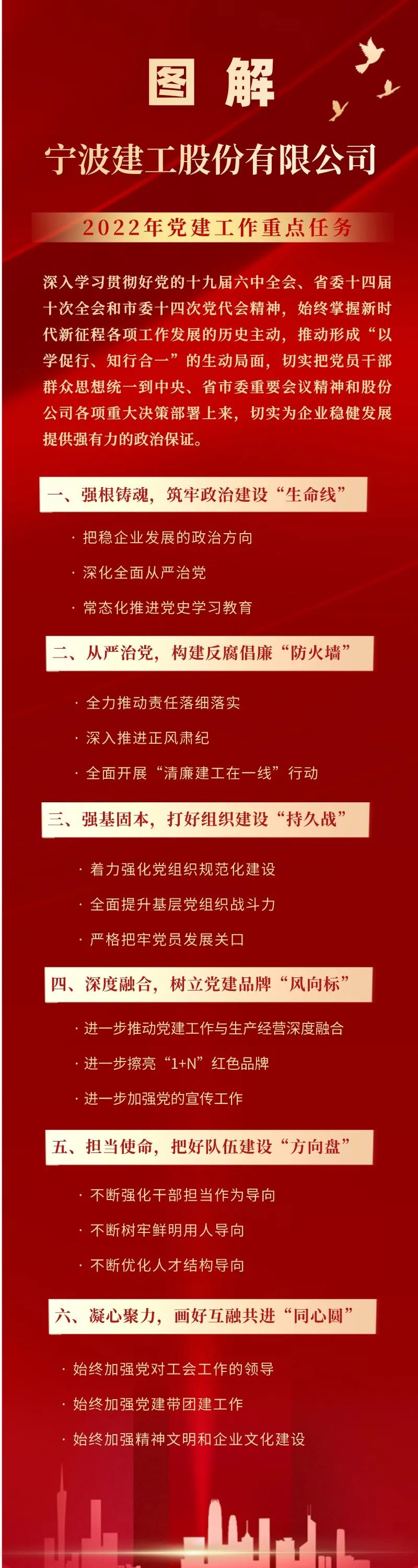 2022年3月9日,宁波建工股份有限公司召开党史学习教育总结暨2022年党建工作推进会。会议认真总结2021年党史学习教育工作,分析存在的问题和不足,提出了2022年度党建工作重点任务和目标。