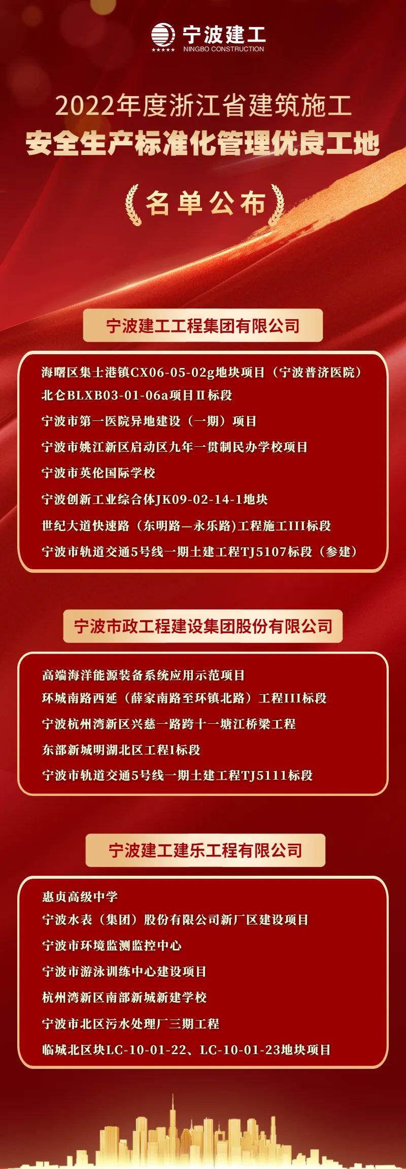 近日,浙江省住建厅发布《2022年度浙江省建筑施工安全生产标准化管理优良工地公示》文件,593个工程被评为2022年度浙江省建筑施工安全生产标准化管理优良工地。其中,宁波建工股份有限公司下属三家总承包企业,宁波建工集团、宁波市政集团、宁波建工建乐公司共19个项目荣登榜单。