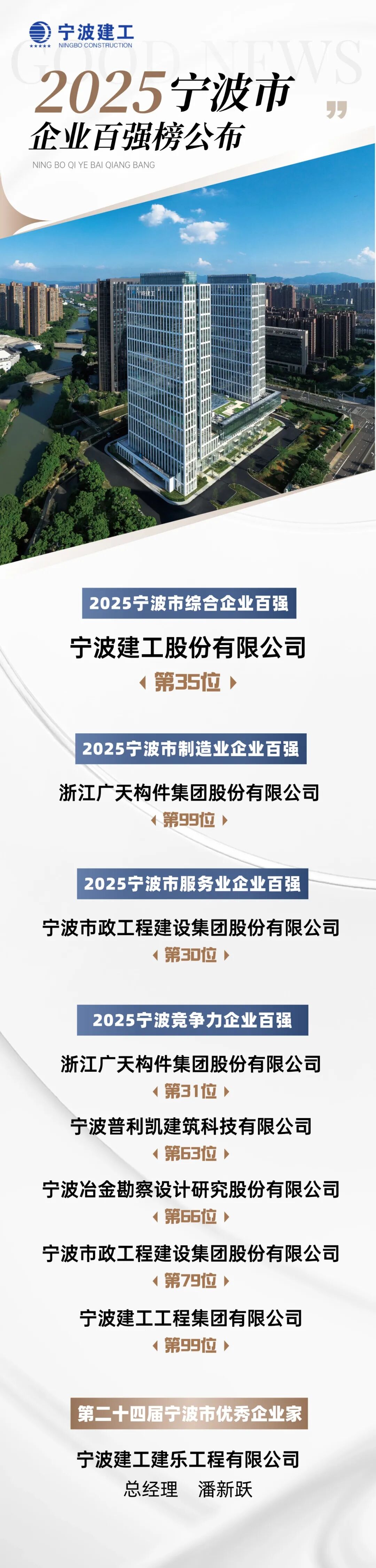其中,宁波建工股份有限公司登榜“2025宁波市综合企业百强榜”第35位,另有下属子公司分别荣登制造业企业百强、服务业企业百强以及竞争力企业百强榜单。