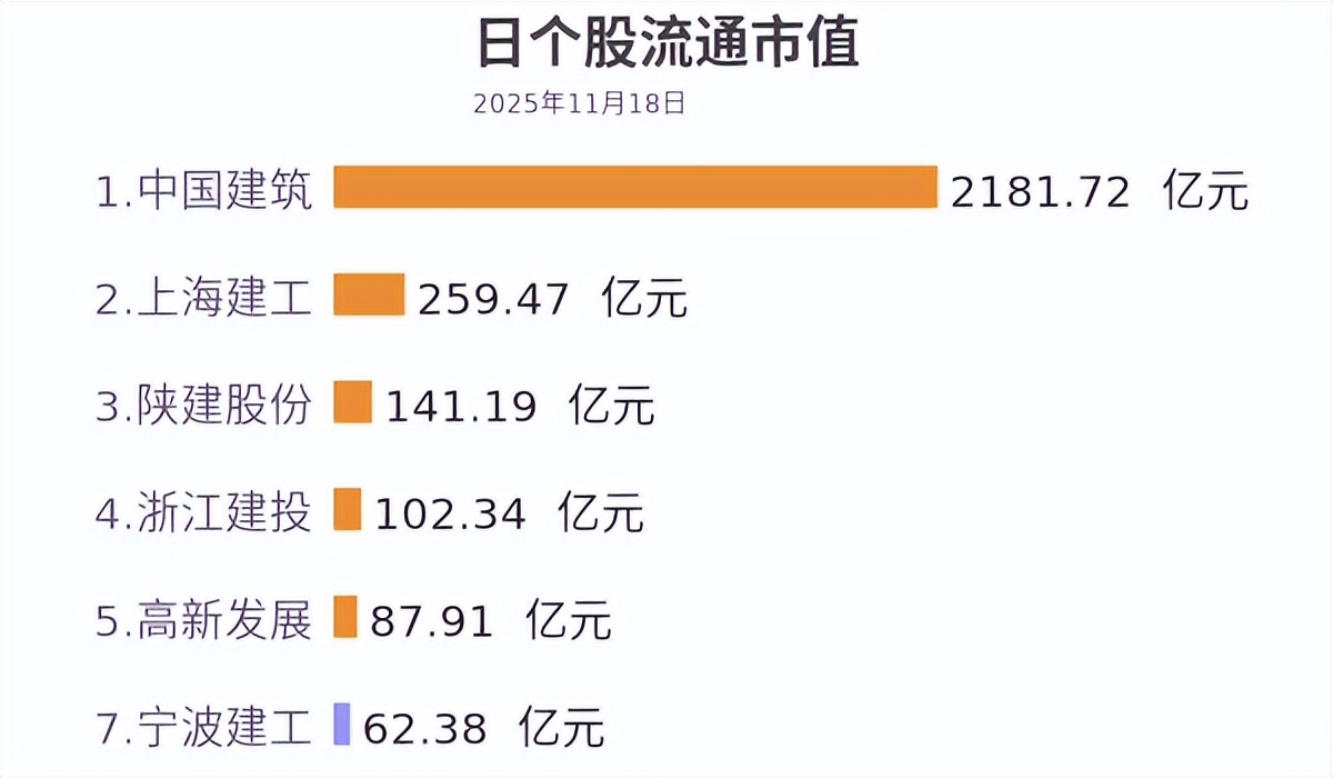 根据日个股流通市值排序,宁波建工的日个股流通市值为62.38亿元,在房屋建设Ⅱ行业中,排名第7,排名前三位的分别是:中国建筑,上海建工,陕建股份。 |