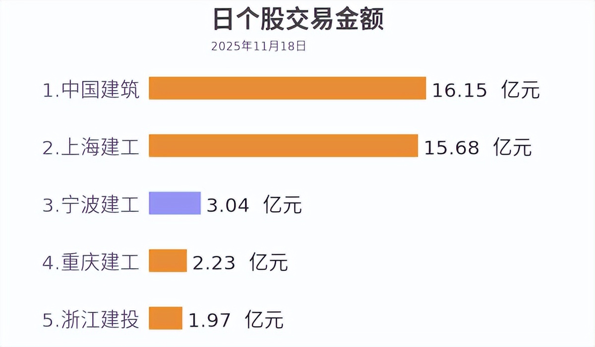 | 根据日个股交易金额排序,宁波建工的日个股交易金额为3.04亿元,在房屋建设Ⅱ行业中,排名第3,排名前三位的分别是:中国建筑,上海建工,宁波建工。 |