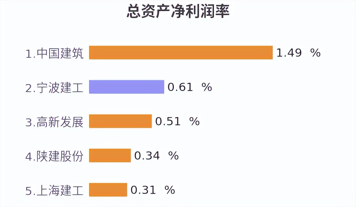 根据总资产净利润率排序,宁波建工的总资产净利润率为0.61%,在房屋建设Ⅱ行业中,排名第2,排名前三位的分别是:中国建筑,宁波建工,高新发展。 |