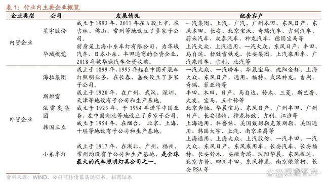 目前,汽车灯具行业内主要企业包括海拉集团、斯坦雷、法雷奥集团、韩国三立、小糸车灯等外资企业和以华域视觉、星宇股份为代表的内资企业。
