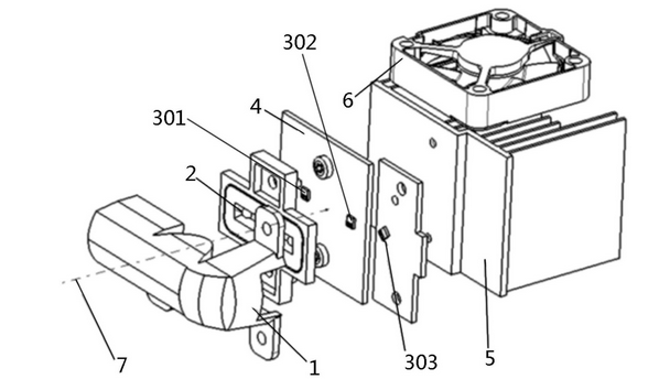 专利摘要显示,本发明公开了一种车灯矩阵式LED散热装置,包括矩阵式LED光源、PCB板、热管组件、散热器和风扇,所述矩阵式LED光源封装在所述PCB板上,所述热管组件安装在所述散热器内,所述PCB板安装在所述散热器的前端,所述风扇安装在所述散热器的后方。该车灯矩阵式LED散热装置可实现体积小、重量轻和成本低;能快速导出矩阵式LED点亮后产生的热量,降低LED温度。