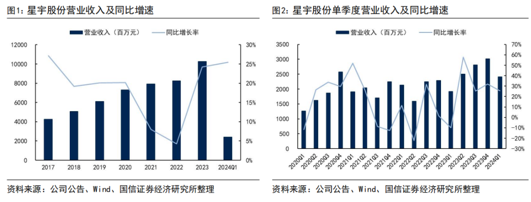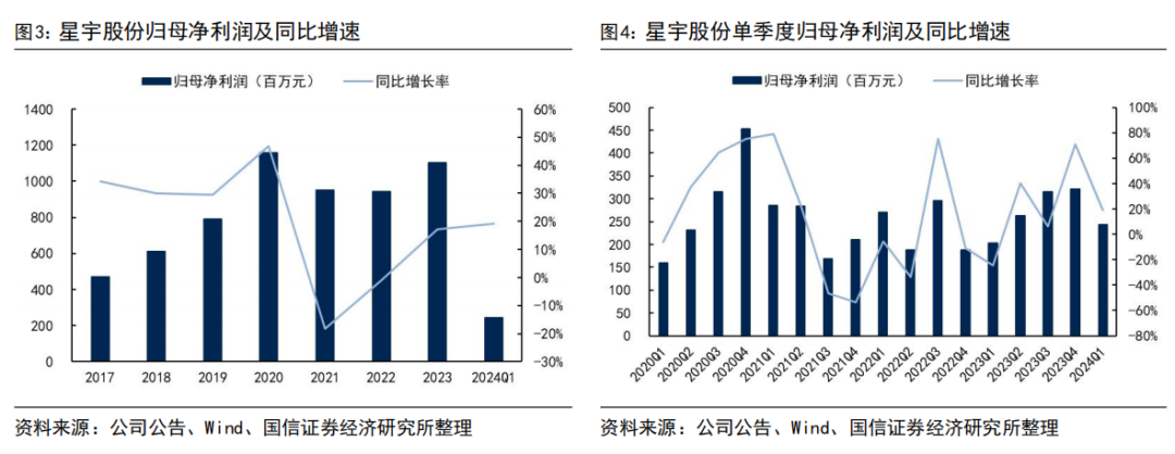 整体来看,2024Q1,存量客户销量增长,叠加新势力增量车型放量,公司营收增速超越汽车行业19pct。2024Q1星宇营收增速25.47%,汽车产量同比增速6.33%,公司营收超越汽车行业19.14pct。根据中汽协产量数据,2024Q1,一汽大众、奇瑞、一汽丰田、一汽红旗、东风日产、理想汽车、广汽丰田产量分别同比变动+3.4%/+73.2%/-14.4%/+54.8%/-17.0%/+85.3%/-23.3%。