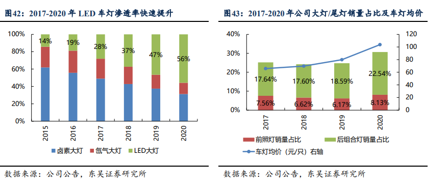 车灯LED升级+大灯/尾灯占比提升驱动产品均价迅速提升。