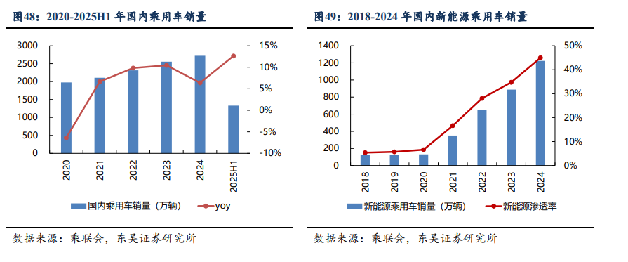 行业销量结构发生较大变化,新能源渗透率持续提升。国内新能源乘用车行业销量从2019年的120.35万辆快速提升至2024年的1223.19万辆,复合增长率高达59.00%。对应的新能源乘用车渗透率也从2019年的5.7%快速提升至2024年的45.0%。