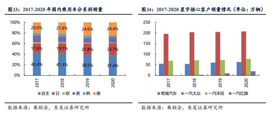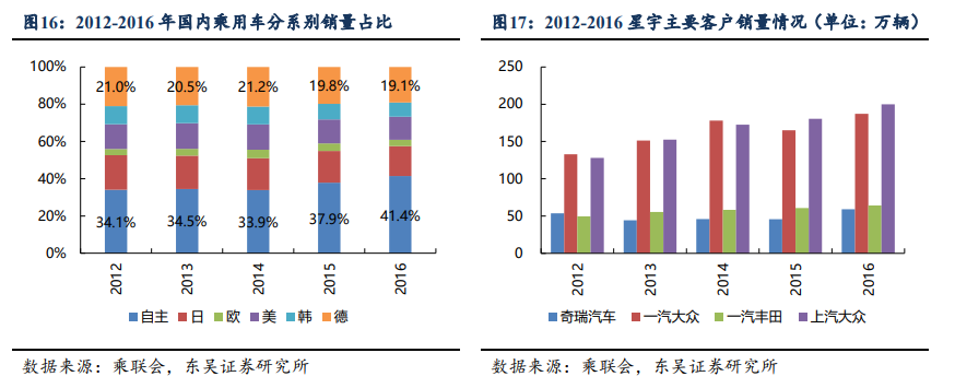 星宇核心客户中南北大众销量持续增长,奇瑞和一丰销量保持稳定。2012-2016年,南北大众销量分别从128万辆和133万辆持续增长至200万辆和187万辆。一汽丰田由于这一阶段中日关系遇冷从而在中国市场的发展有所放缓;奇瑞汽车销量在这段时间也整体停滞在50万辆/年的量级。