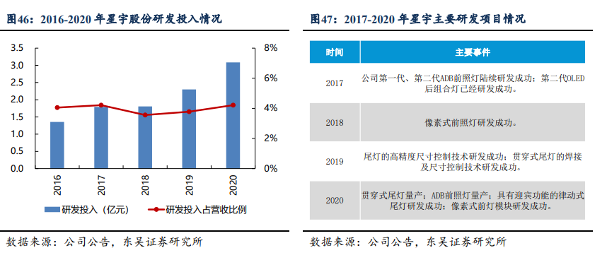 星宇在2017-2020年享受车灯LED升级红利的同时,持续前瞻布局智能车灯技术研发。星宇持续紧跟车灯行业的前沿技术发展方向,提前布局智能车灯产品,于2017年成功研发ADB大灯,2018年成功研发像素式前照灯,2019-2020年成功研发贯穿式尾灯和交互式尾灯,为后续车灯智能化的持续升级打下基础。